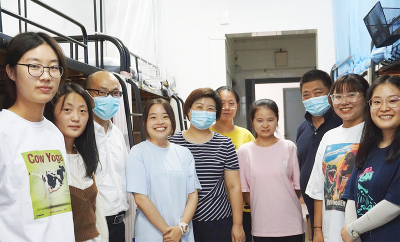 10月4日下午,斗球直播 党委书记朱小娟、院长陆国君,党委副书记、副院长陈俊怀带领全体辅导员深入新生宿舍,亲切看望2021级新同学。