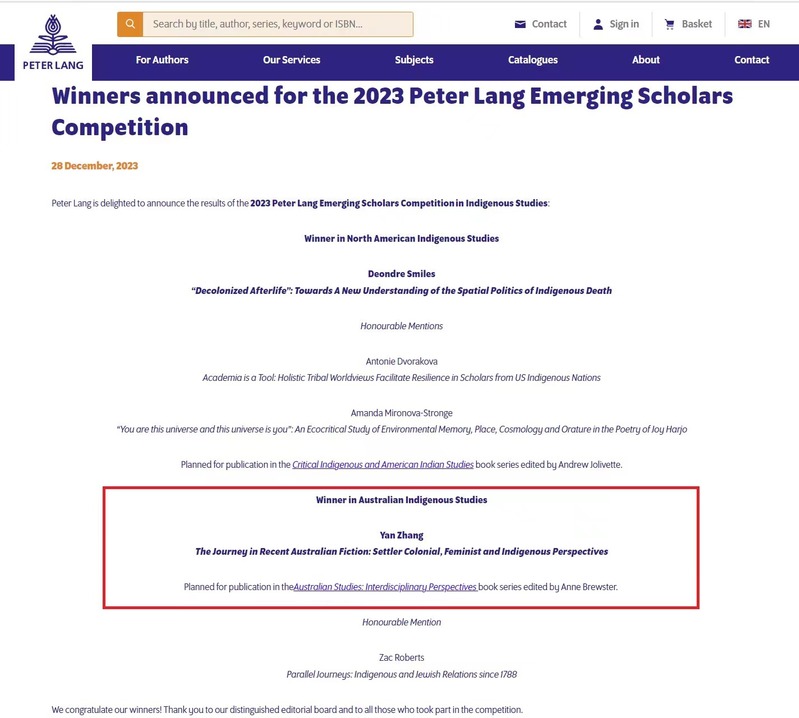 近日,兰培德国际学术出版集团(Peter Lang)“2023年度青年学者大赛”(2023 Peter Lang Emerging Scholars Competition)结果揭晓,我校斗球直播 张艳博士的博士学位论文“当代澳大利亚小说中的旅行:定居殖民、女性主义和原住民的视角”(“The Journey in Recent Australian Fiction: Settler Colonial, Feminist and Indigenous Perspectives”)成功入选年度出版项目,将作为《澳大利亚研究:跨学科的视角》学术专著系列之一由兰培德出版集团出版。这是斗球直播 青年教师首次获得国外知名学术出版社出版项目资助。