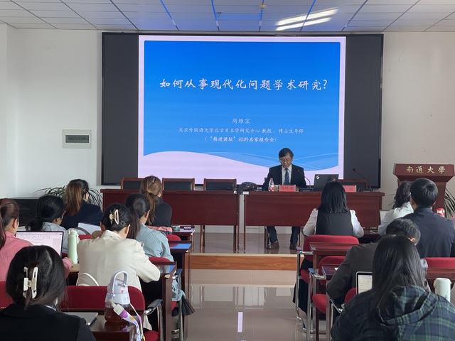 10月24日下午,北京外国语大学日语斗球直播 北京日本学研究中心博士生导师周维宏教授应邀莅临我校“精进讲坛”,为师生作题为《如何从事现代化问题学术研究》的学术报告。