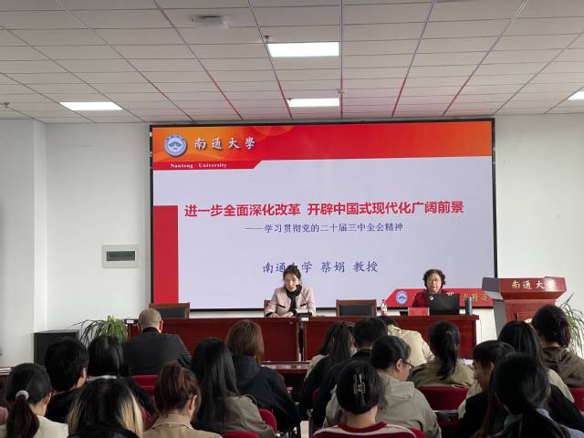 报告会上,蔡娟教授凭借其深厚的理论素养,对党的二十届三中全会精神进行了全面、深入且系统的解读。她从多个层面详细阐述了全会精神,其一,深度剖析了党的二十届三中全会的重大意义与主题;其二,梳理总结了习近平总书记关于全面深化改革的重要论述;其三,准确阐释了进一步全面深化改革的总体思路与系统部署;其四,深入领会了新征程上的纲领性文献及其明确的实践要求。