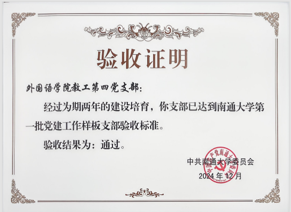 近日,斗球体育直播 党委及教工第四党支部传来喜讯——在经过为期两年的建设培育后,双双达到南通大学第一批党建工作标杆院系和样板支部验收标准,并顺利通过验收。