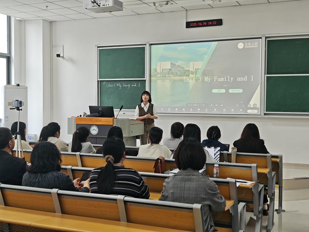 本次教研活动以“提升课堂设计能力,优化教学方法”为主题,通过说课展示、模拟授课、小组研讨、专家点评等多种形式,深入打磨教师教学技能。活动中,金晖老师以《新思路综合英语(第一册)》第三单元“My Family and I”为例,首先详细阐述了课程设计思路,随后进行了精彩的教学模拟演示。她在授课过程中巧妙运用AI工具辅助教学,与学生积极互动,展现出扎实的教学基本功和先进的教学理念。