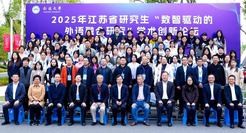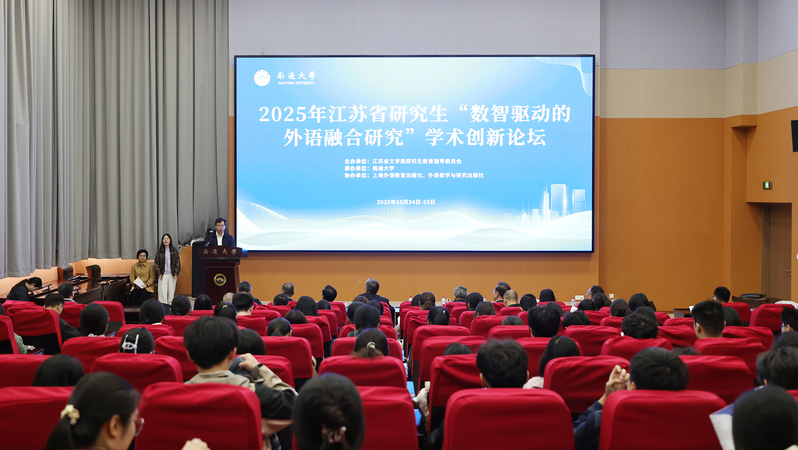 10月25日,2025年江苏省研究生“数智驱动的外语融合研究”学术创新论坛在我校举办。论坛由江苏省文学类研究生教育指导委员会主办,南通大学承办,外语教学与研究出版社、上海外语教育出版社协办。南通大学党委常委、副校长、研究生院院长施佺,研究生院常务副院长、学科建设办公室主任吴丽,省内知名专家、学者出席开幕式。来自全国19所高校的100余名硕博研究生参加论坛。