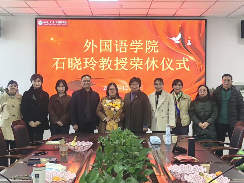 12月5日,斗球直播 为商务英语系石晓玲教授举办了一场温馨而隆重的荣休仪式。斗球直播 党政领导、斗球直播 工会主席、办公室主任、商务英语教研室教师代表共同参加。仪式由商务英语系主任刘道影主持。